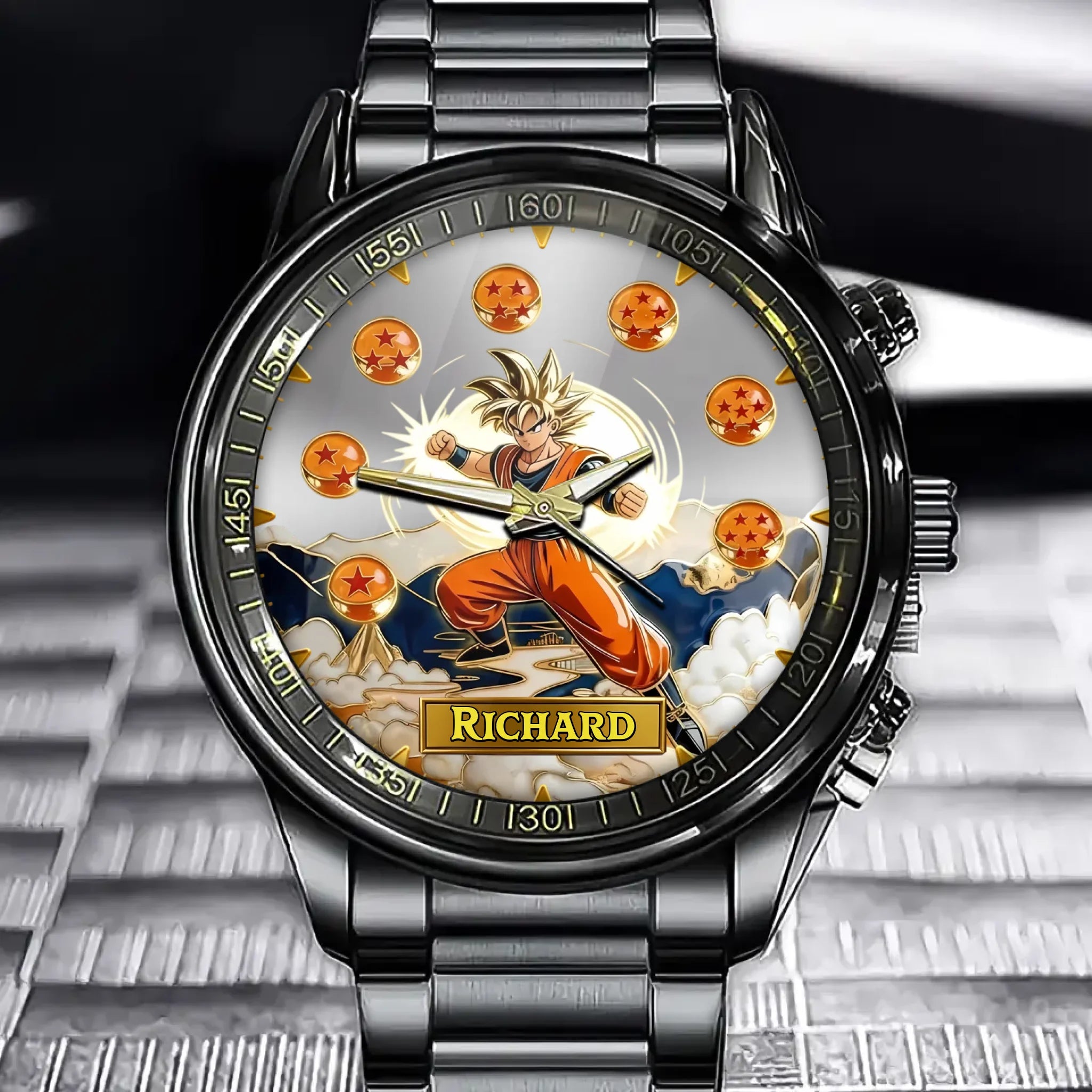 Personalized Anime Hero Watch - Spiky-Haired Warrior & Energy Orbs Theme with Custom Name