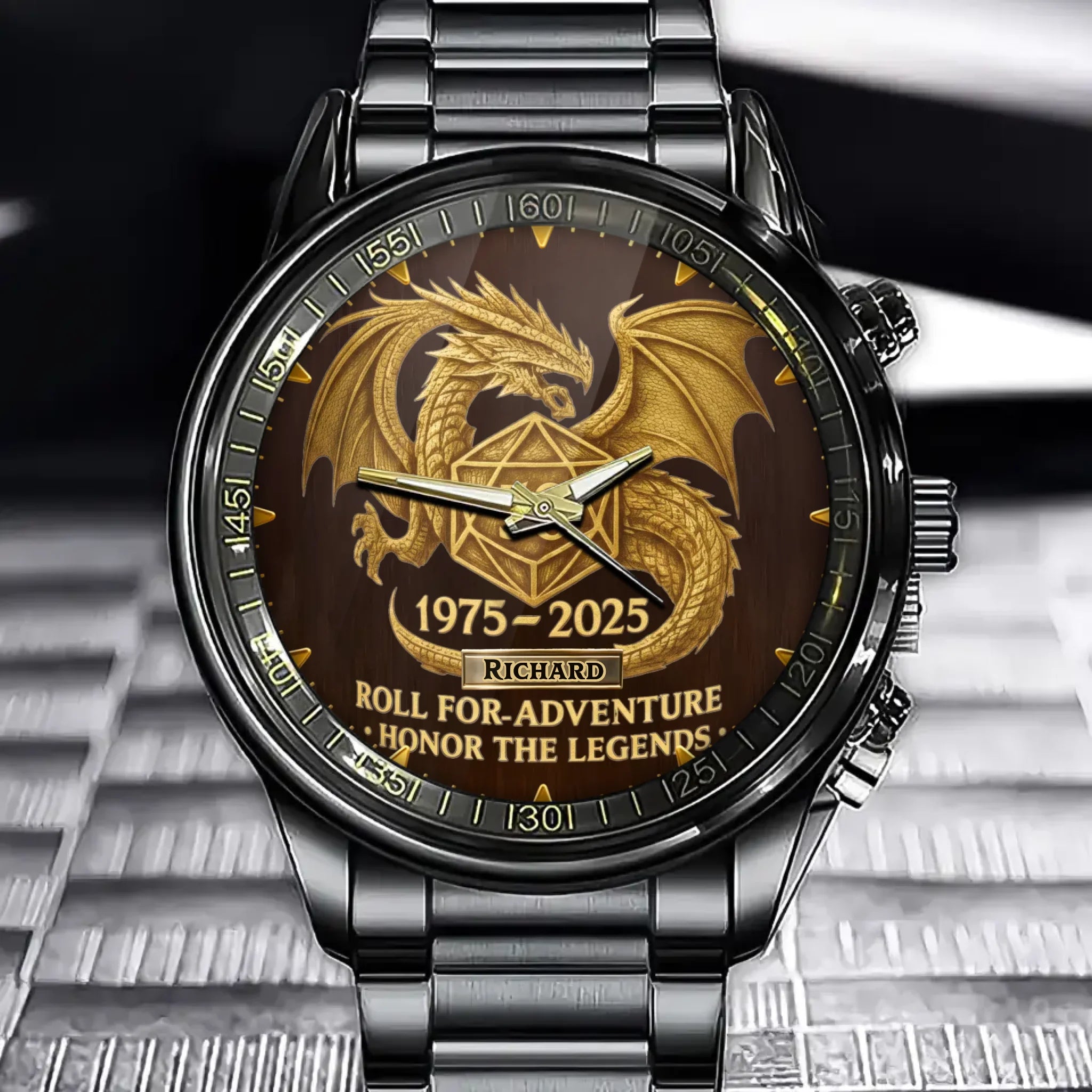 Personalized D&D 50th Anniversary Fantasy Watch – Gold Dice & Dragon Design