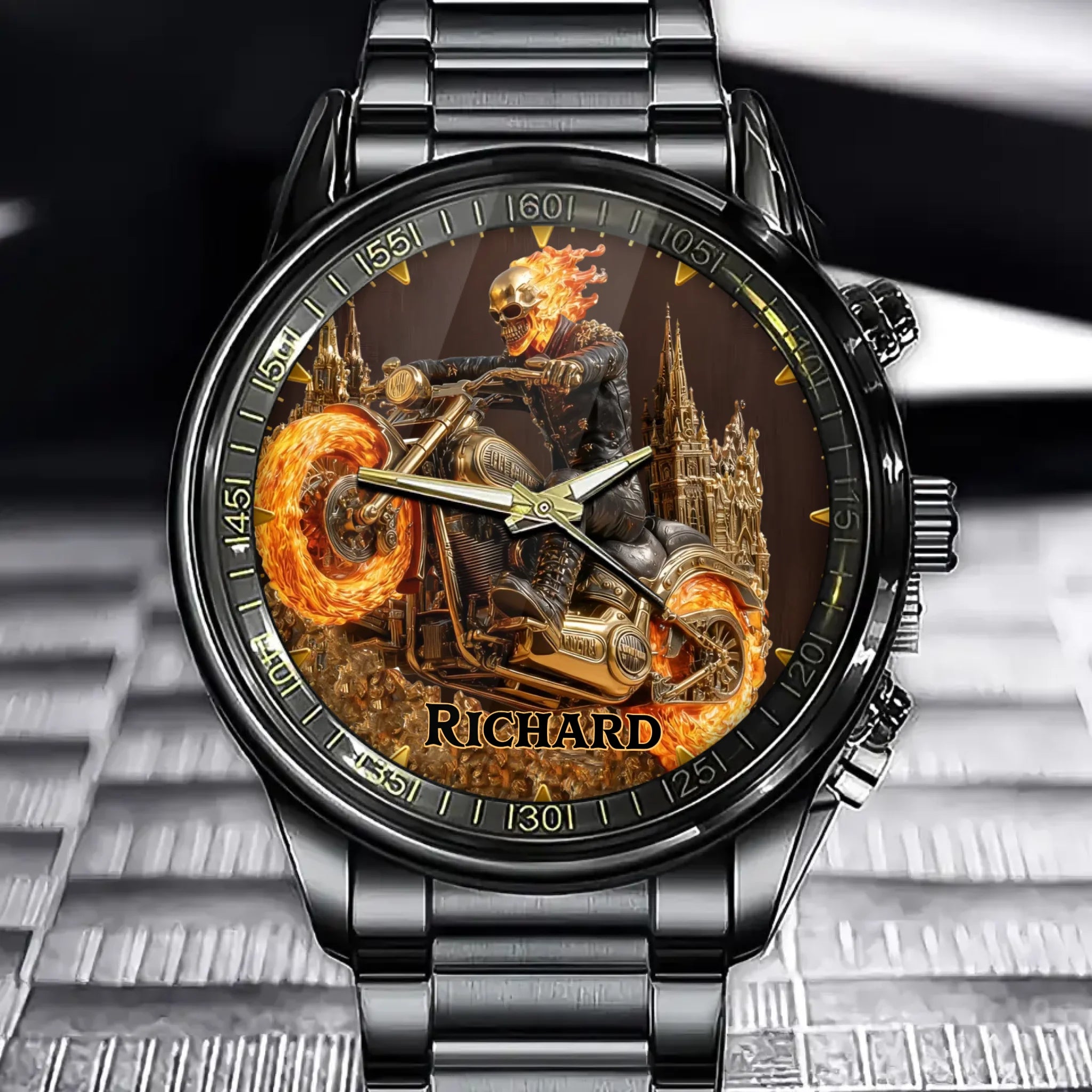 Personalized Flame Rider Watch - Custom Flame Skull & Motorcycle Design Timepiece for Speed Enthusiasts
