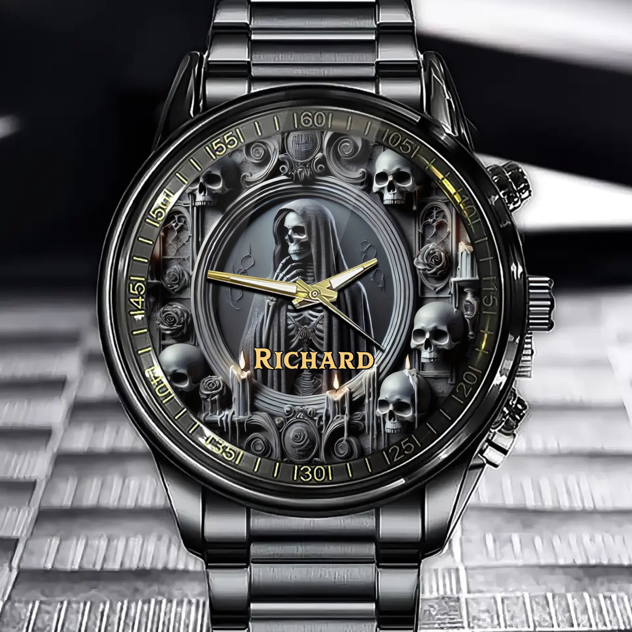 Personalized Gothic Watch - Dark Skeleton Theme with Name Customization