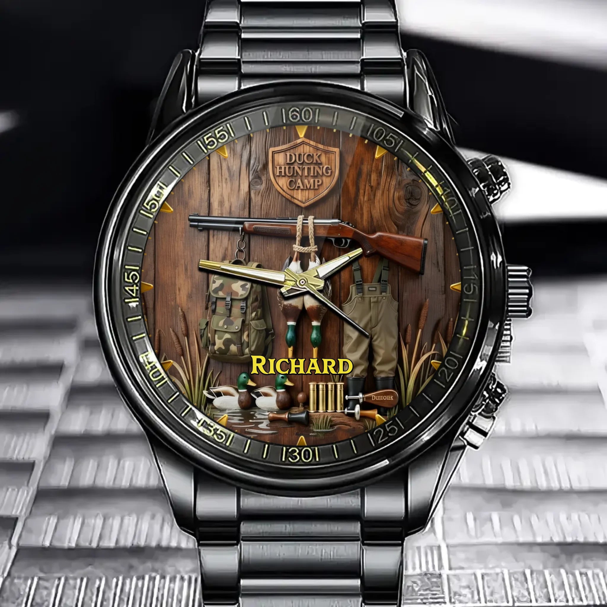 Personalized Hunting Camp Watch - Duck & Rifle Gear Design with Custom Name