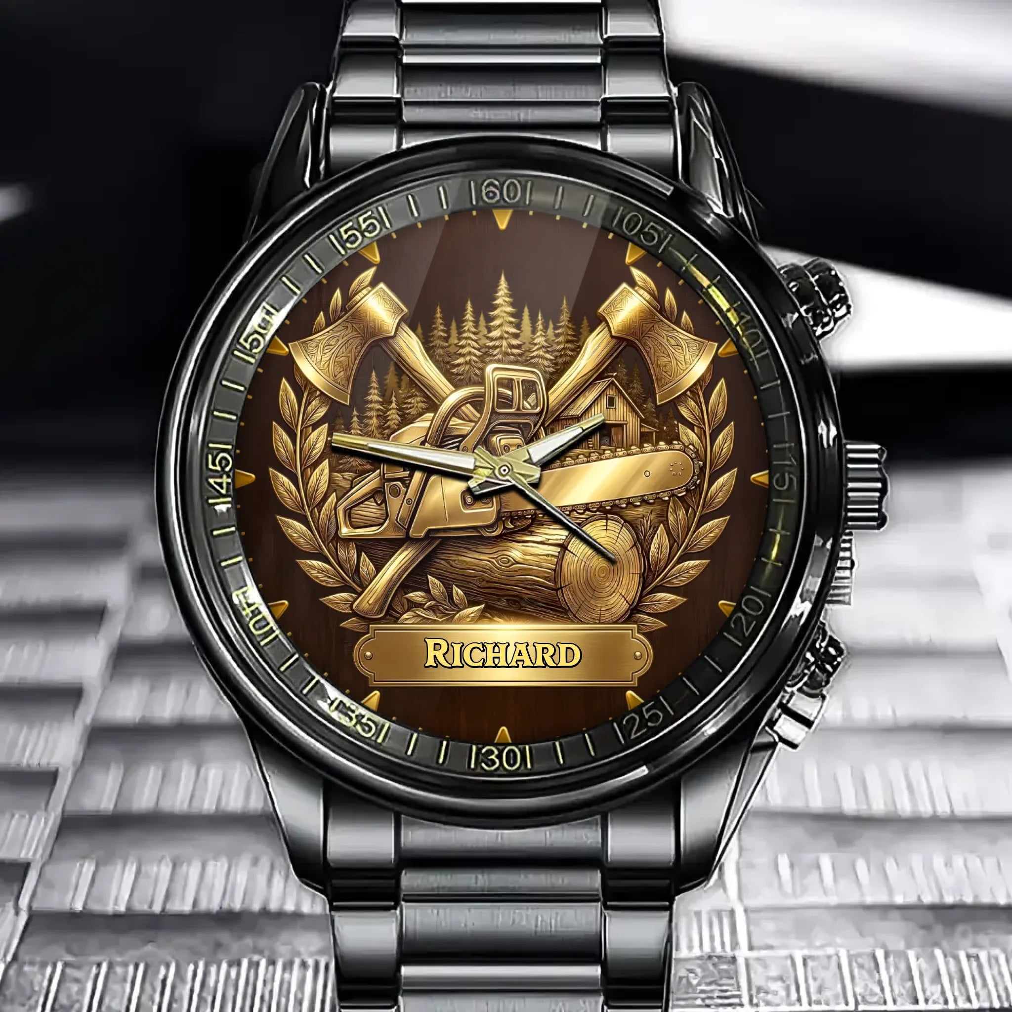 Personalized Lumberjack Watch with Custom Chainsaw and Axe Design