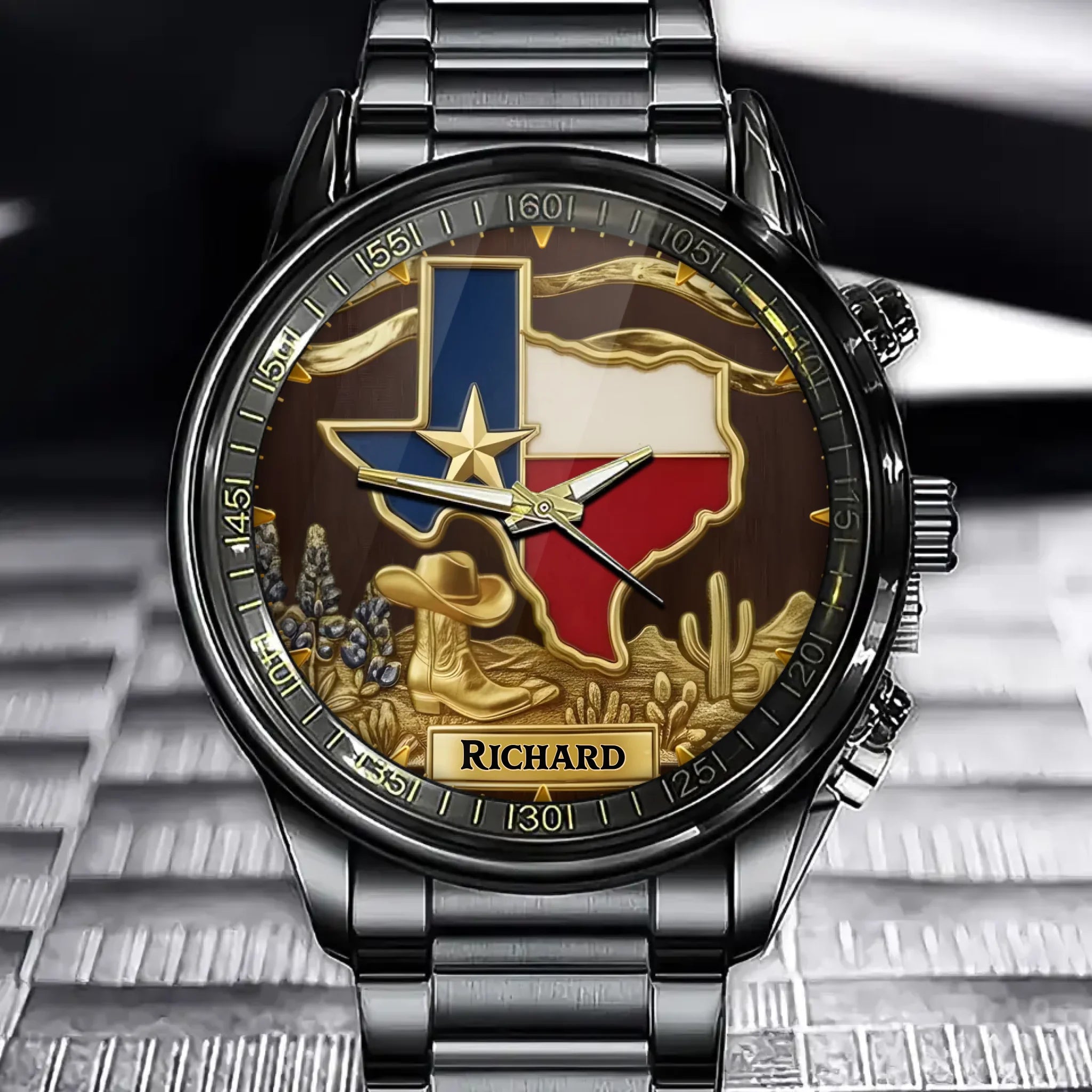 Personalized Strong Texas Watch - Engraved Western Cowboy Boots & Bluebonnet Cactus Themed Timepiece