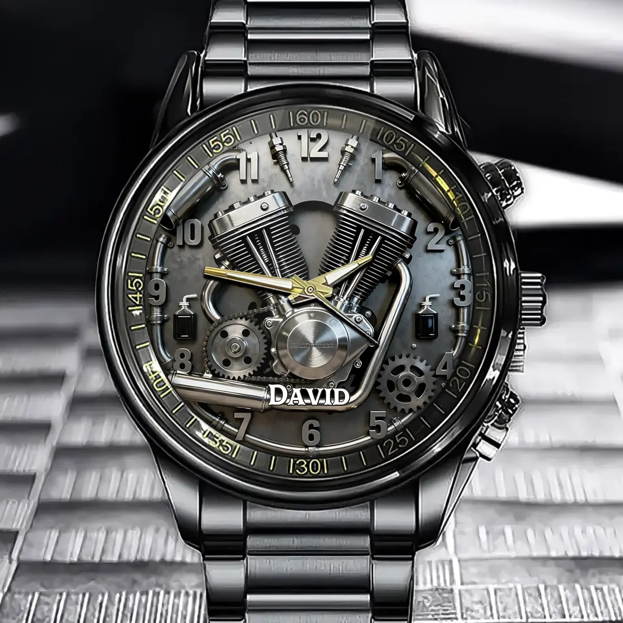 Personalized Twin-Cylinder Motorcycle Engine Watch - Gears & Pipes Themed Dial with Custom Name