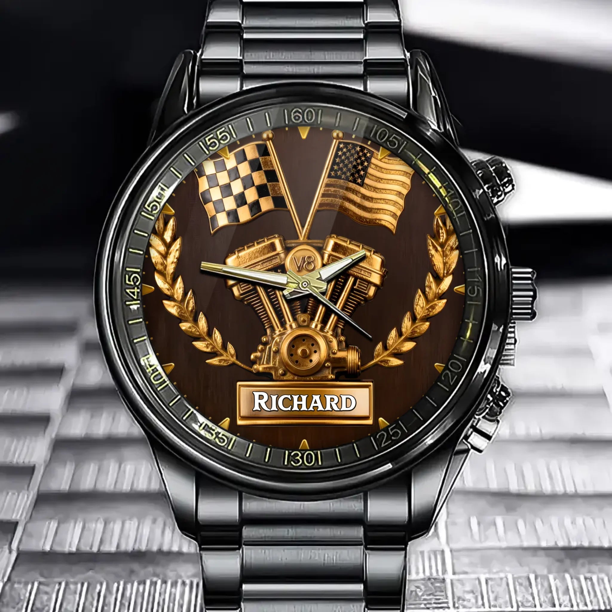 Personalized V8 Engine Watch - Custom Watch With Driver's Flag And American Flag Style