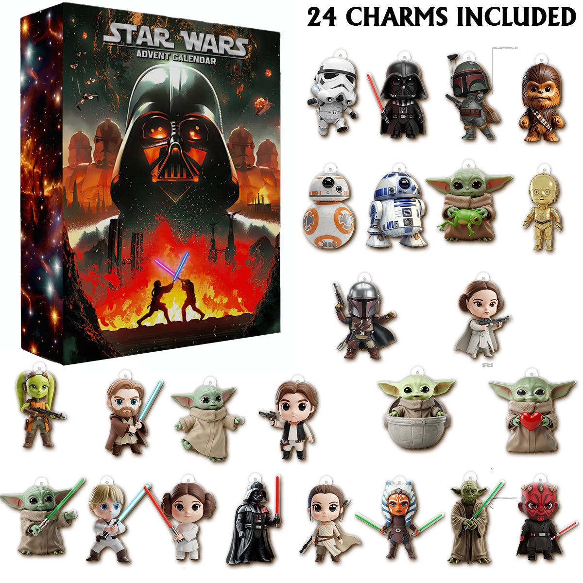 💥✨ Celebrate the legendary Star Wars saga with this exclusive Advent Calendar, featuring 24 collectible charms inspired by your favorite heroes, villains, and droids from across the galaxy!